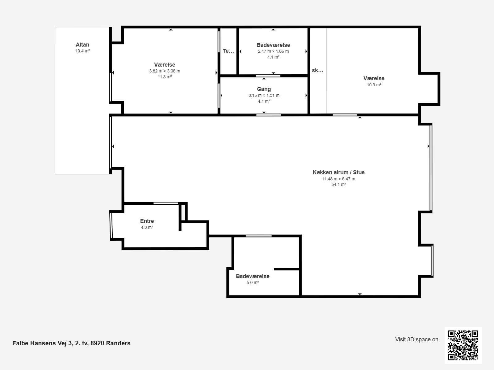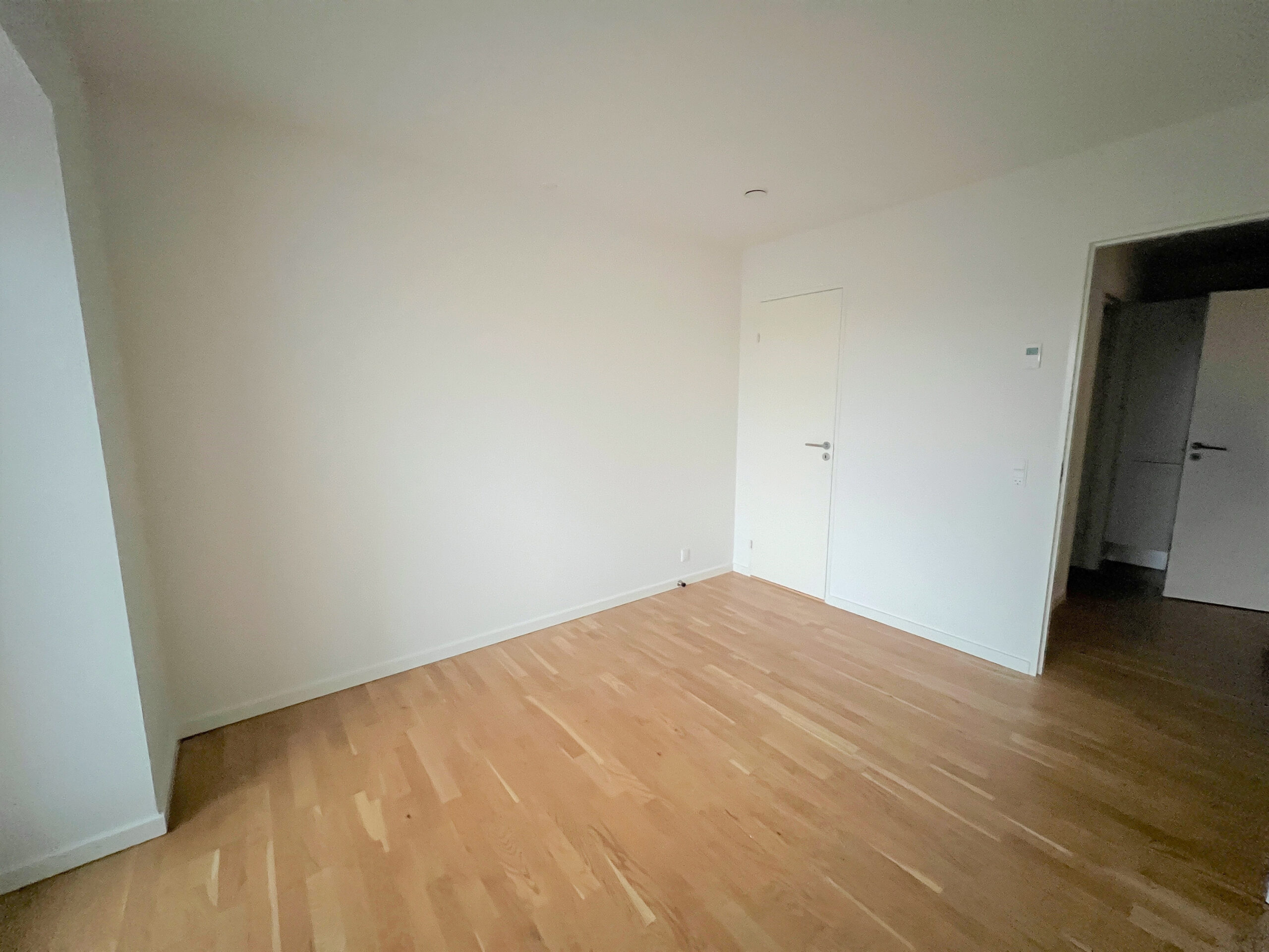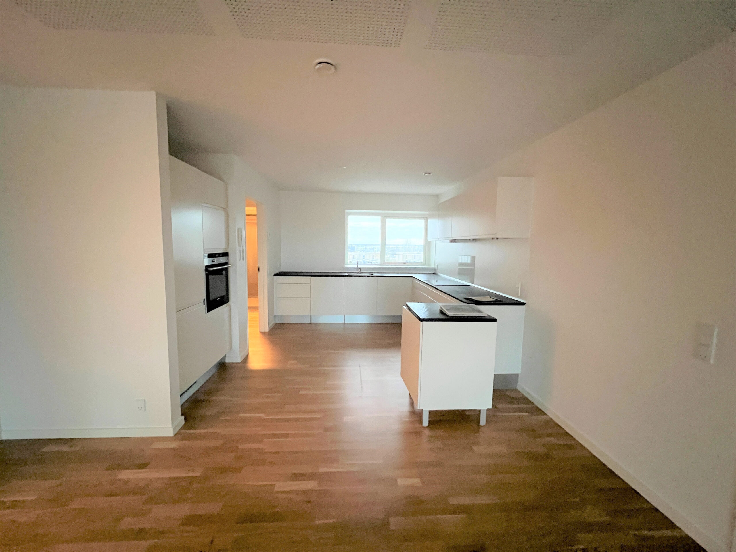 Lejligheden har et flot, moderne køkken med hvide elementer og alle nødvendige hårde hvidevarer. Køkkenet ligger i åben forbindelse med det store køkken-alrum, hvor der er rigelig plads til både spisebord og sofagruppe – perfekt til hyggelige middage eller afslapning i hverdagen.