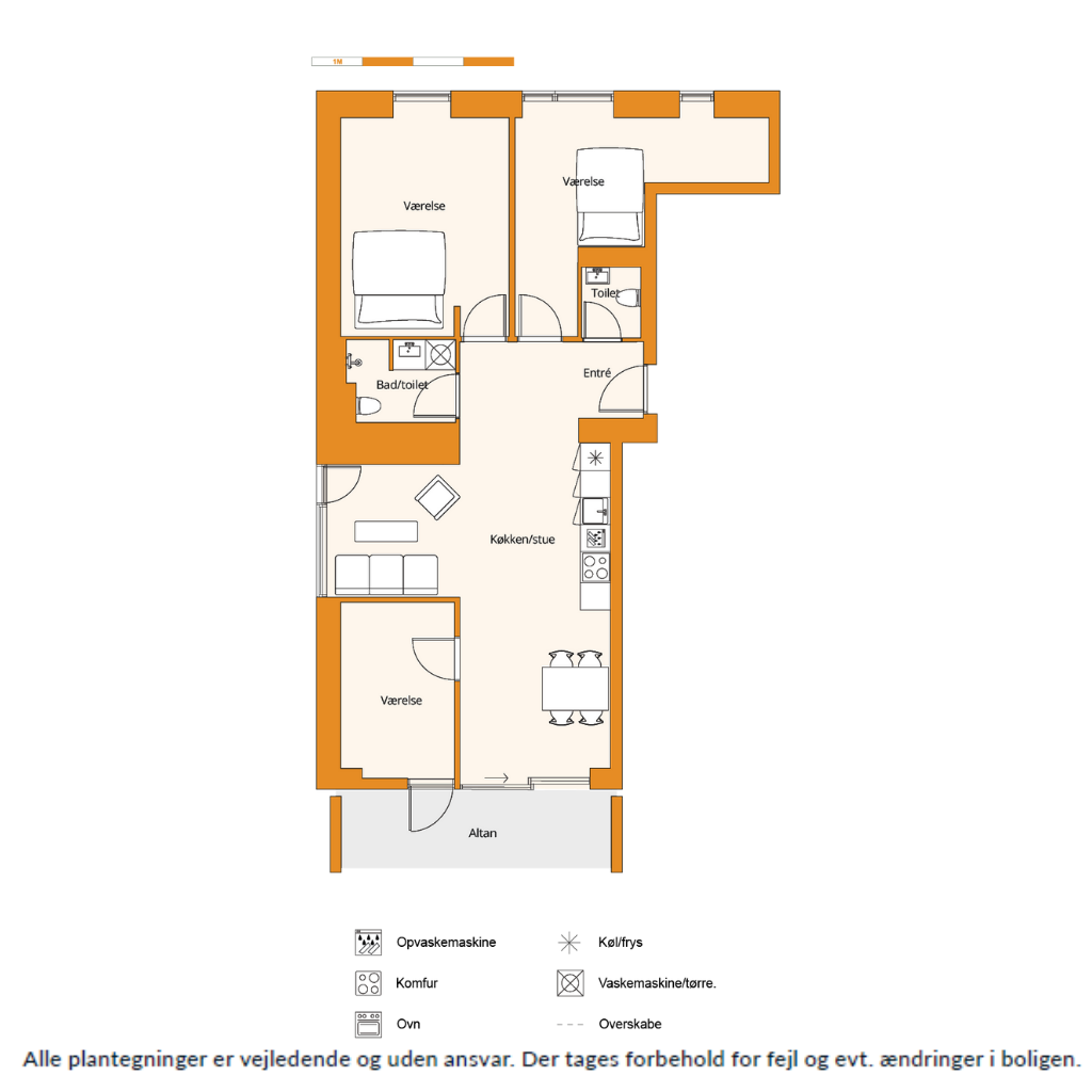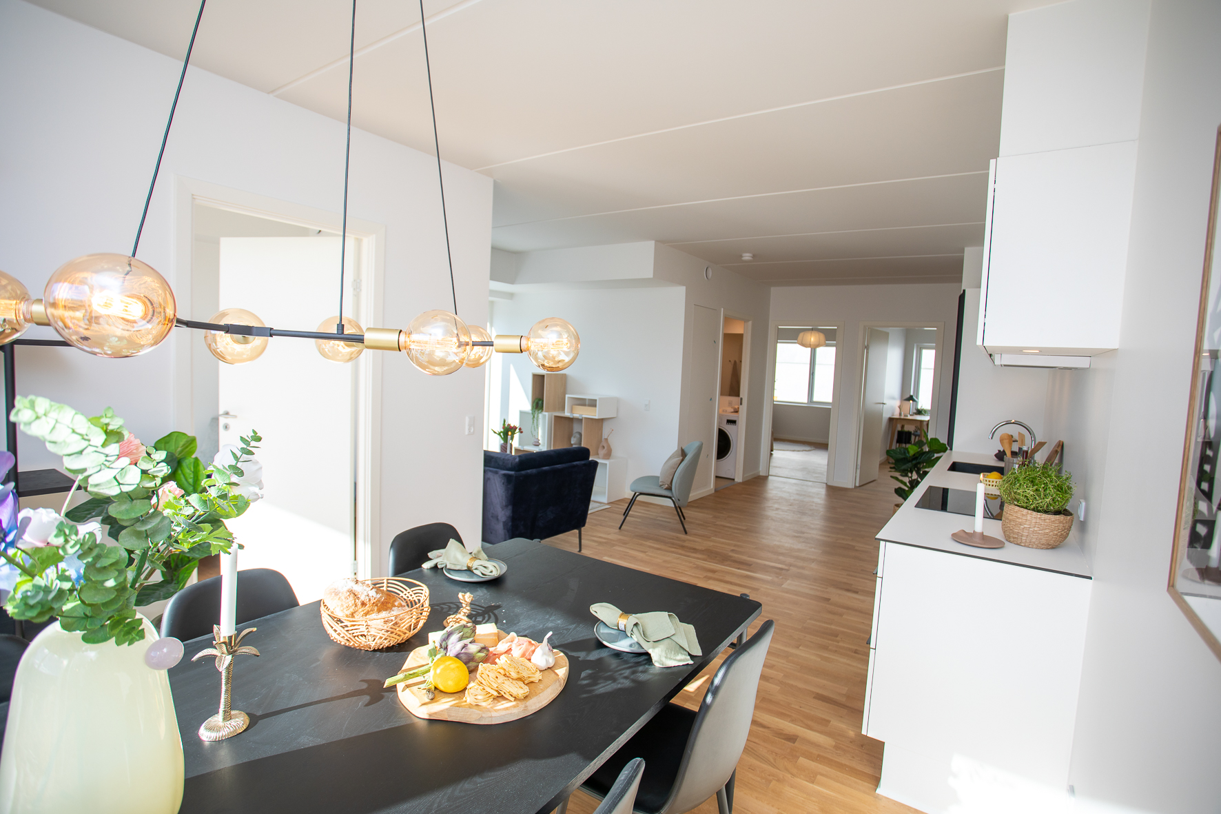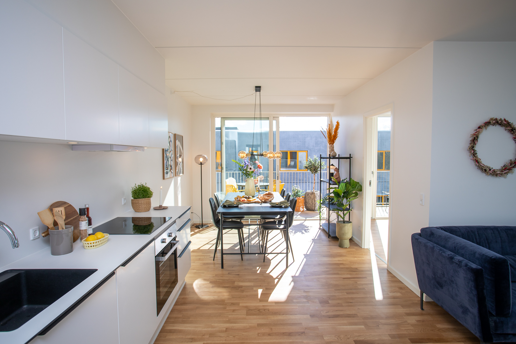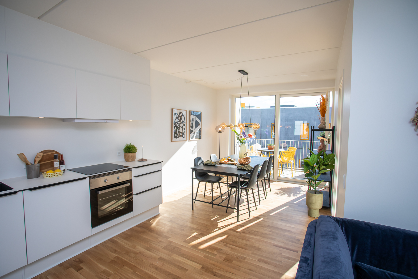 Lejligheden byder på et stort og indbydende køkken-alrum, hvor der er plads til både madlavning og samvær. Køkkenet er udstyret med alt, hvad du behøver: køle-/fryseskab, opvaskemaskine, induktionskogeplade og indbygningsovn.