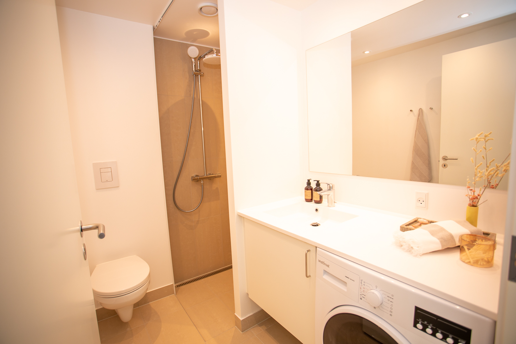 Badeværelset er moderne og stilfuldt med en praktisk kombi tørre/vaskemaskine. Derudover er der et ekstra gæstetoilet.
